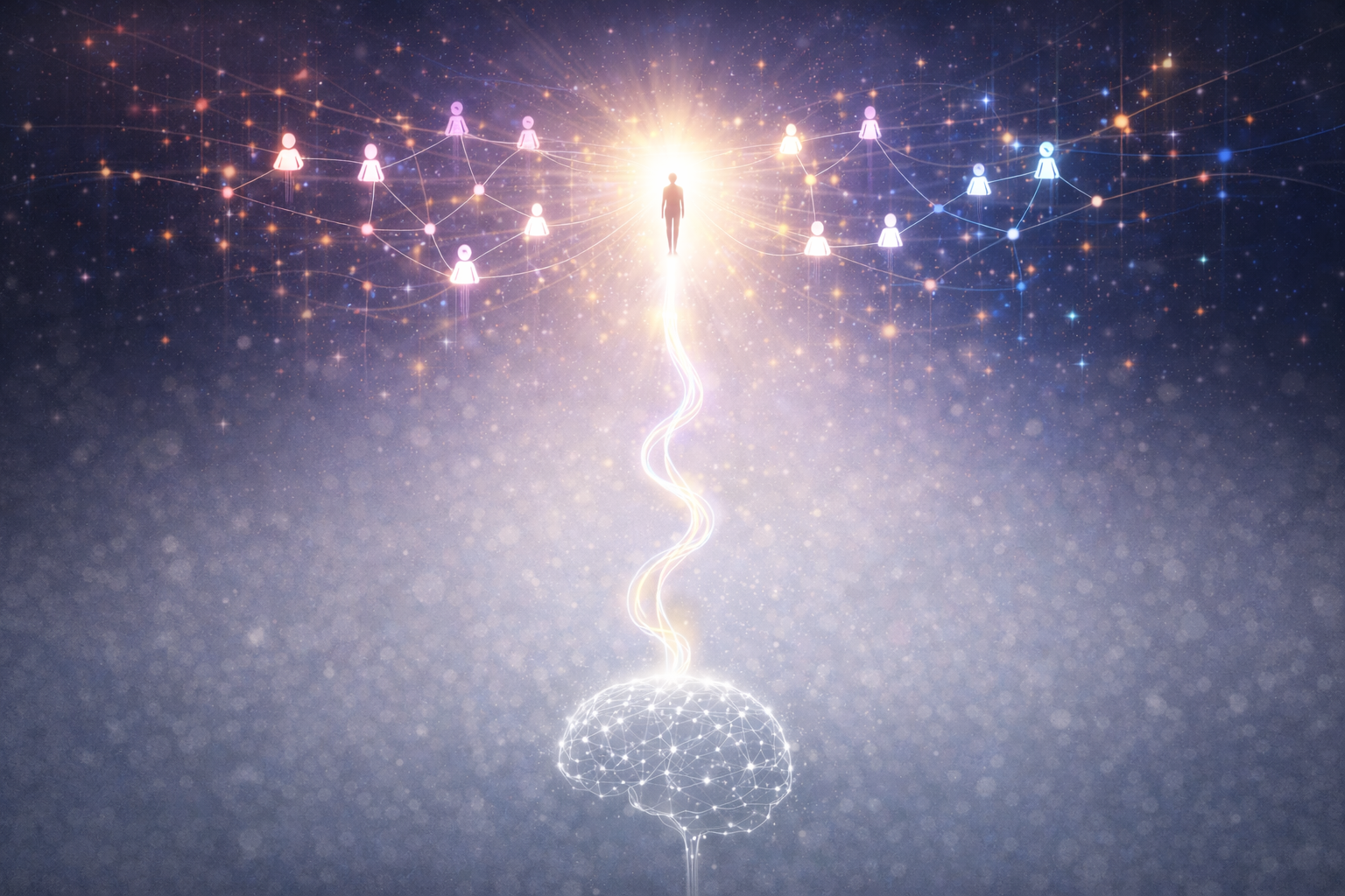 在这一信息论视角下,个体意识不再是孤立的点,而是宇宙意识网络中的节点。每个“我”的经验,都与他者的经验共同构成此刻宇宙的整体呈现。若宇宙被理解为信息场,那么我们每个个体的主观体验便是该场中的扰动模式,其相互作用叠加成了历史这一宏大波函数的实际展开。